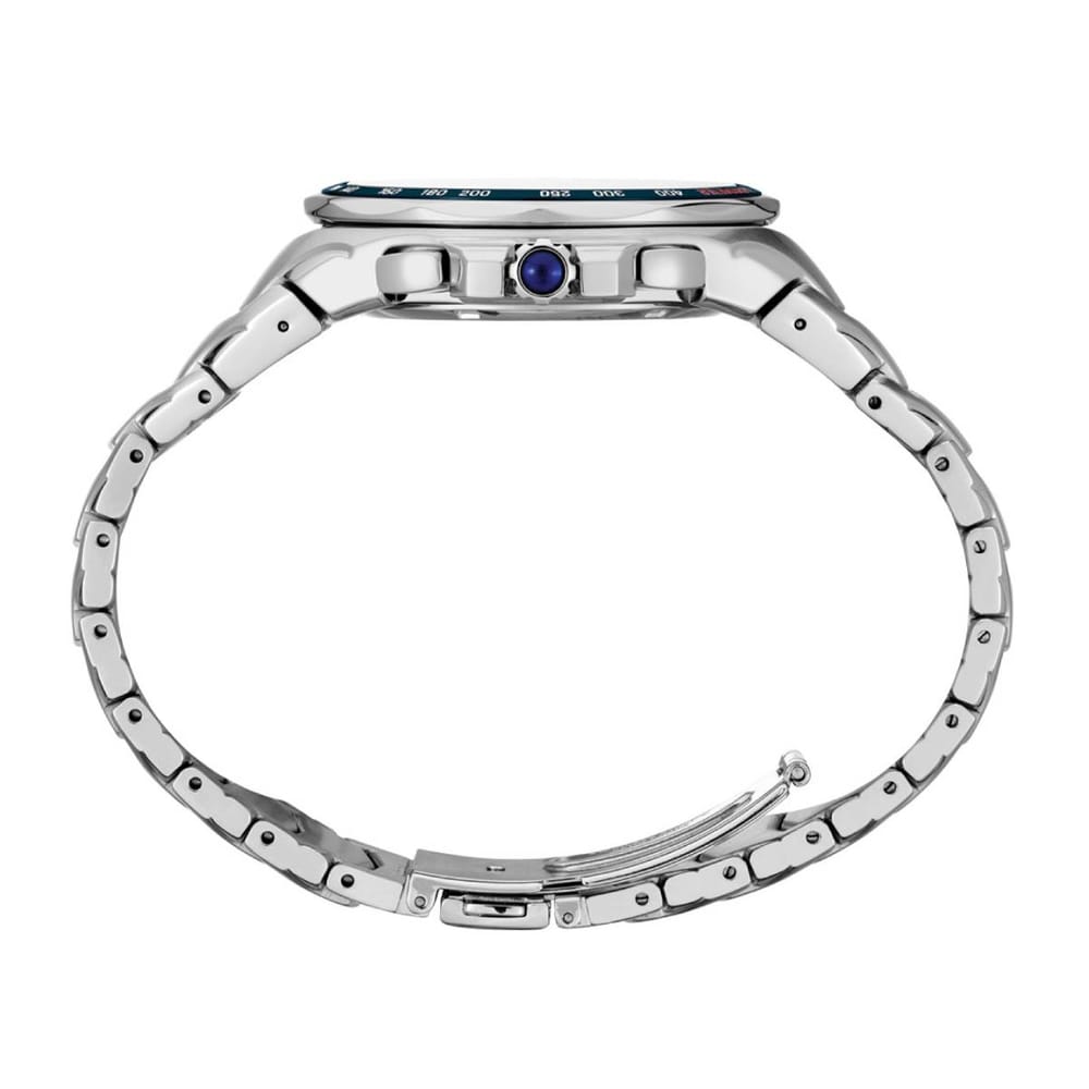 The dial is exquisitely detailed, with a molded-in pattern around the periphery. The blue dial has a sunburst, reflective texture, making it ideal for both sport and dress. Red accents perfectly match the chronograph seconds. To protect the dial, Seiko has chosen to use a scratch-resistant sapphire crystal, to keep the watch looking like new for years to come.