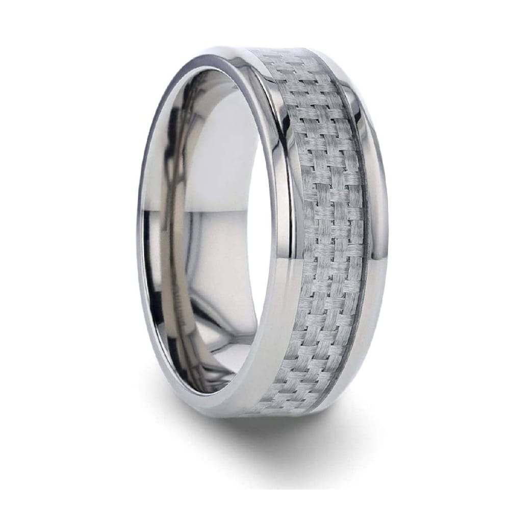 This exquisite titanium ring features a beveled edge design complemented by a striking white carbon fiber inlay. Perfectly crafted for women, this 8mm wide band merges modern aesthetics with lightweight comfort, making it an ideal choice for a wedding band or fashion accessory.