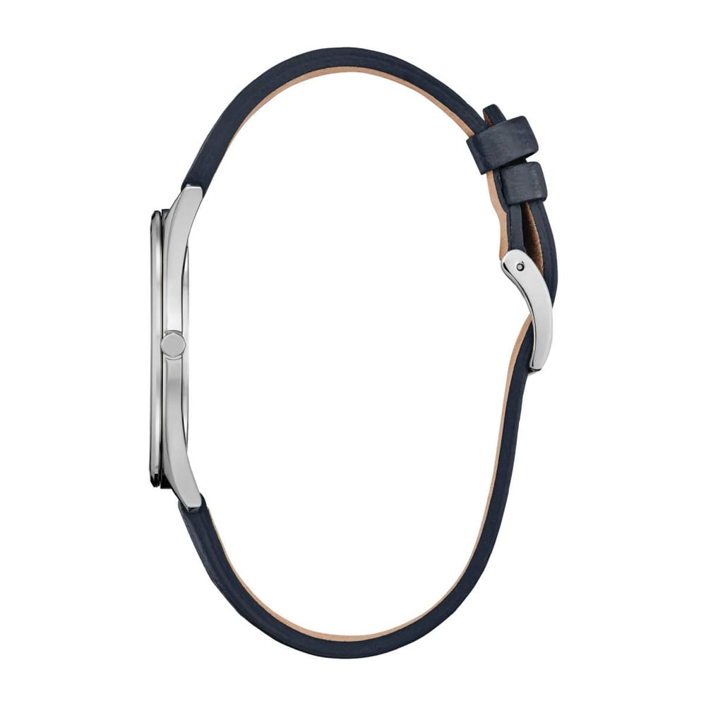 Classic lines and a simple silhouette define the newest addition to the Classic collection. This all-purpose dress watch features a versatile silver-tone stainless steel 38.4mm case, a two-hand blue dial featuring an entrancing metallic powder aesthetic with silver-tone hands and markers, and is secured to the wrist via a grained blue leather strap with buckle closure.