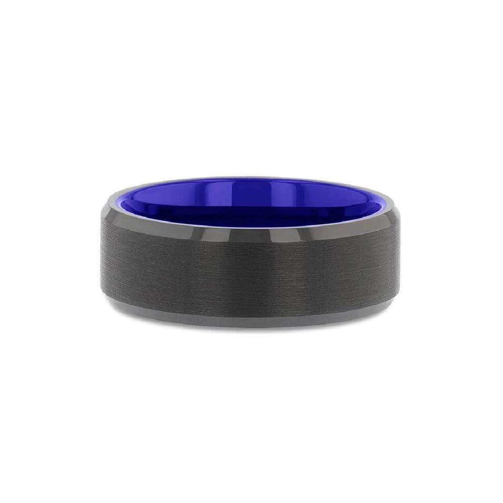 This sophisticated wedding band is crafted from high-quality tungsten, featuring a sleek flat beveled edge design with a brushed center and a vibrant blue interior. With a comfortable fit at size 10, this ring combines durability and style for the modern man.