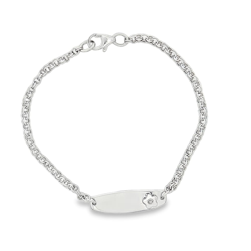 Embrace a touch of creativity with this enchanting Kiddie Kraft identification bracelet, crafted from high-quality .925 silver. Designed for children, this delightful piece features a playful flower theme that adds a whimsical charm to any outfit. Its 6.25-inch length makes it a perfect accessory for everyday wear or special occasions. Elevate your jewelry collection with this adorable yet stylish bracelet that expresses individuality and fun. Get your child’s name engraved for the perfect gift!