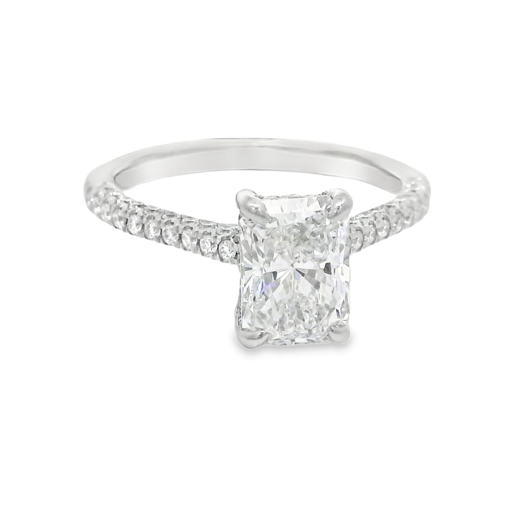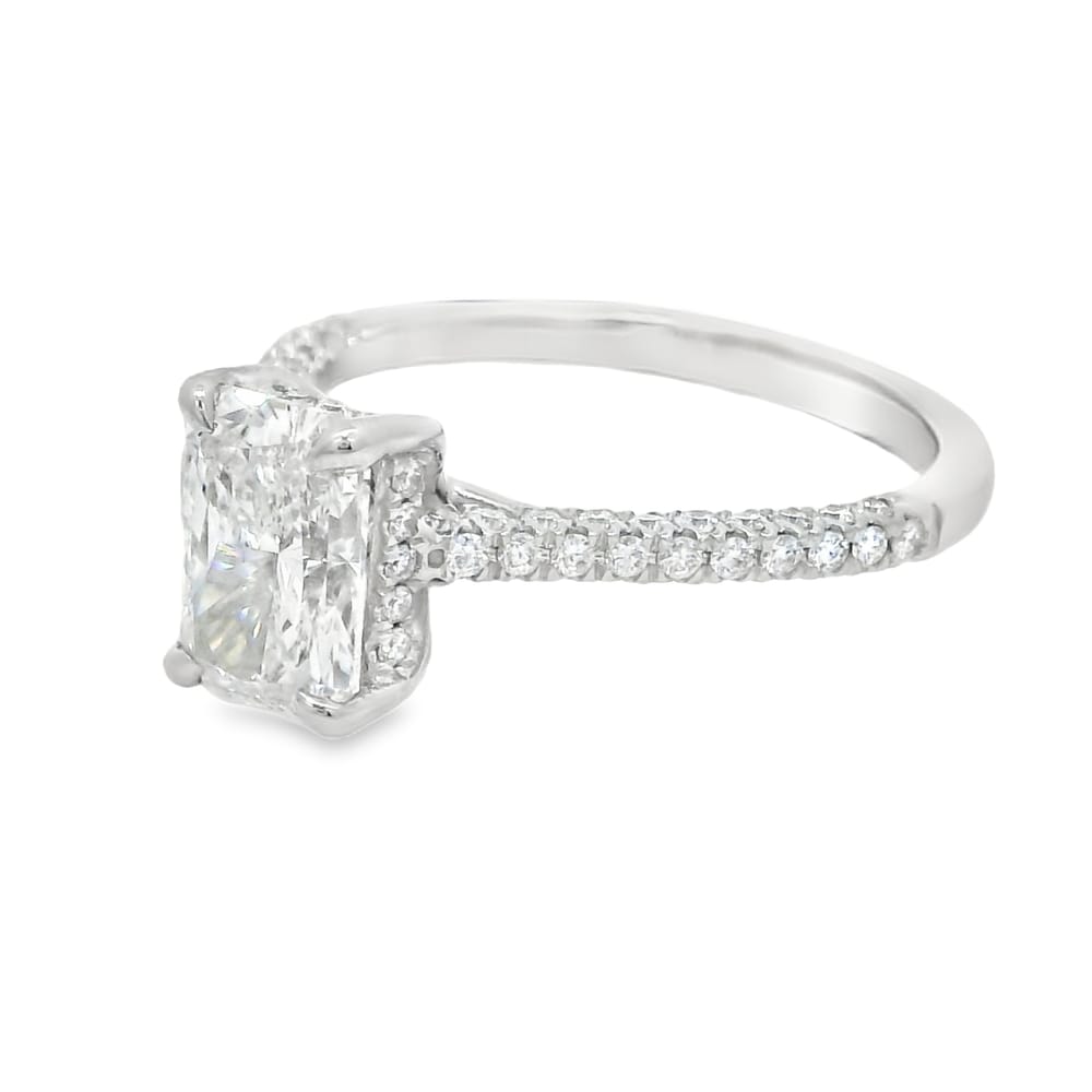 This exquisite engagement ring features a 1.55-carat lab-grown radiant diamond, boasting a flawless F color and VS1 clarity. Set in luxurious 14K white gold, the ring is accented with 0.51 carats of diamond side stones, creating a timeless and elegant statement for the discerning bride-to-be.