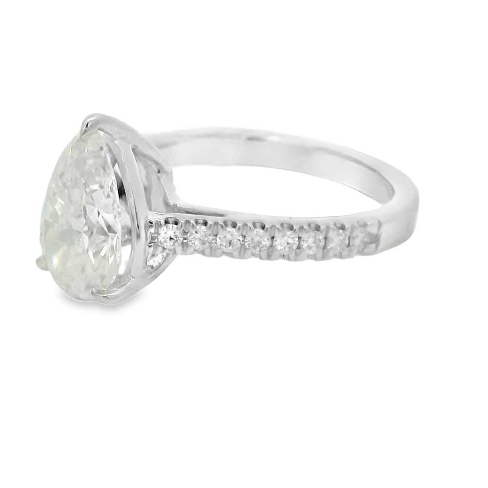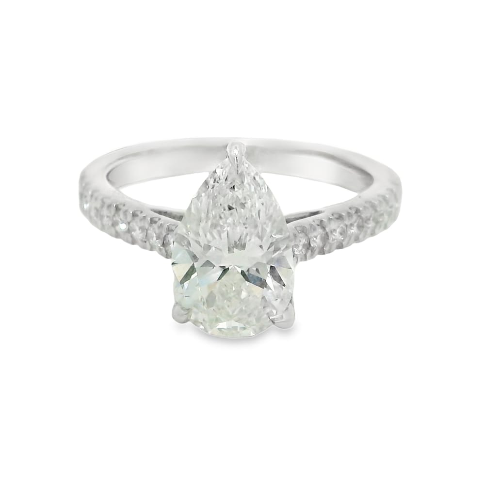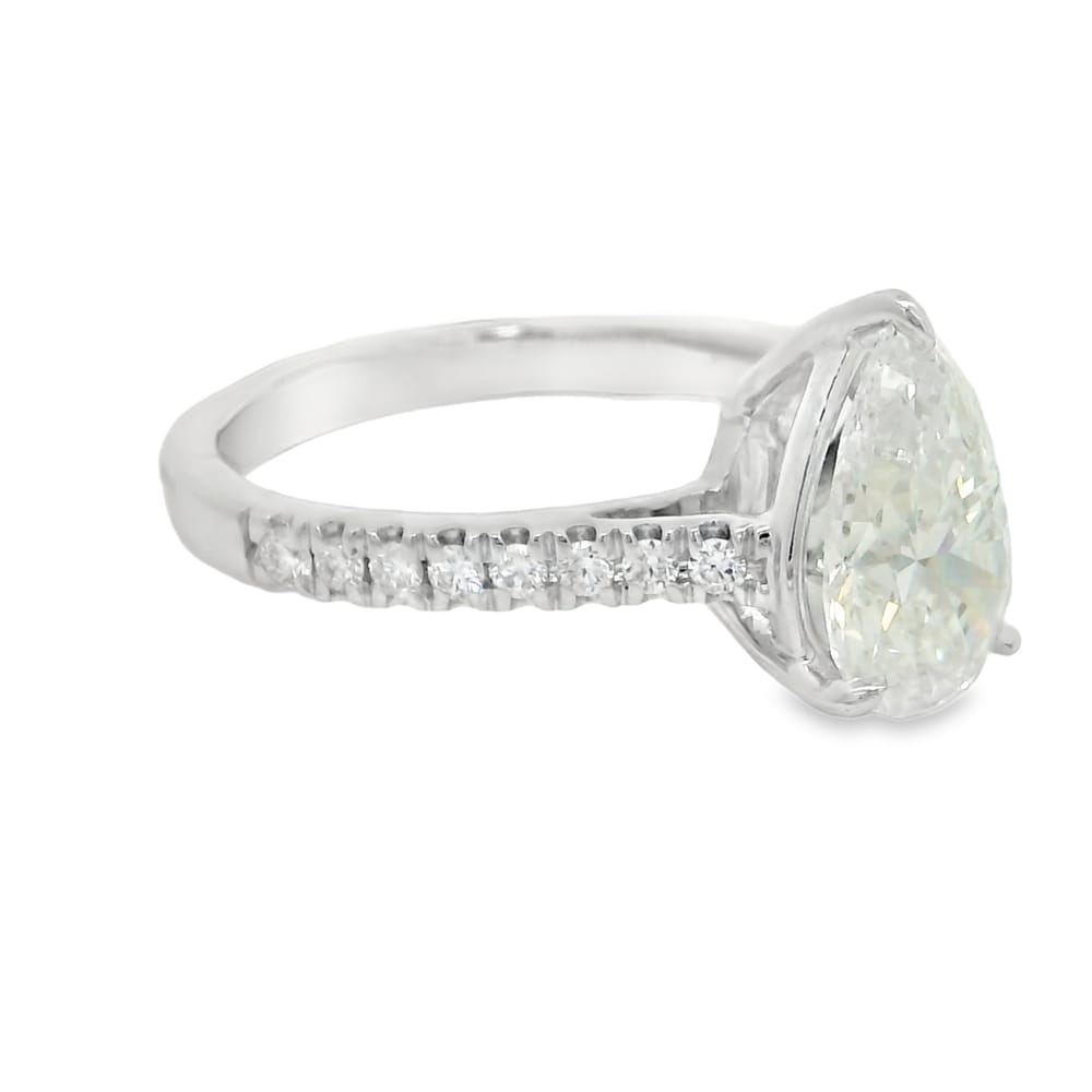 This exquisite engagement ring features a 2.05 carat lab-grown pear-shaped diamond, elegantly set in lustrous 14K white gold. The diamond is rated F in color and VS1 in clarity, offering a brilliant sparkle alongside 0.24 carats of side diamonds.