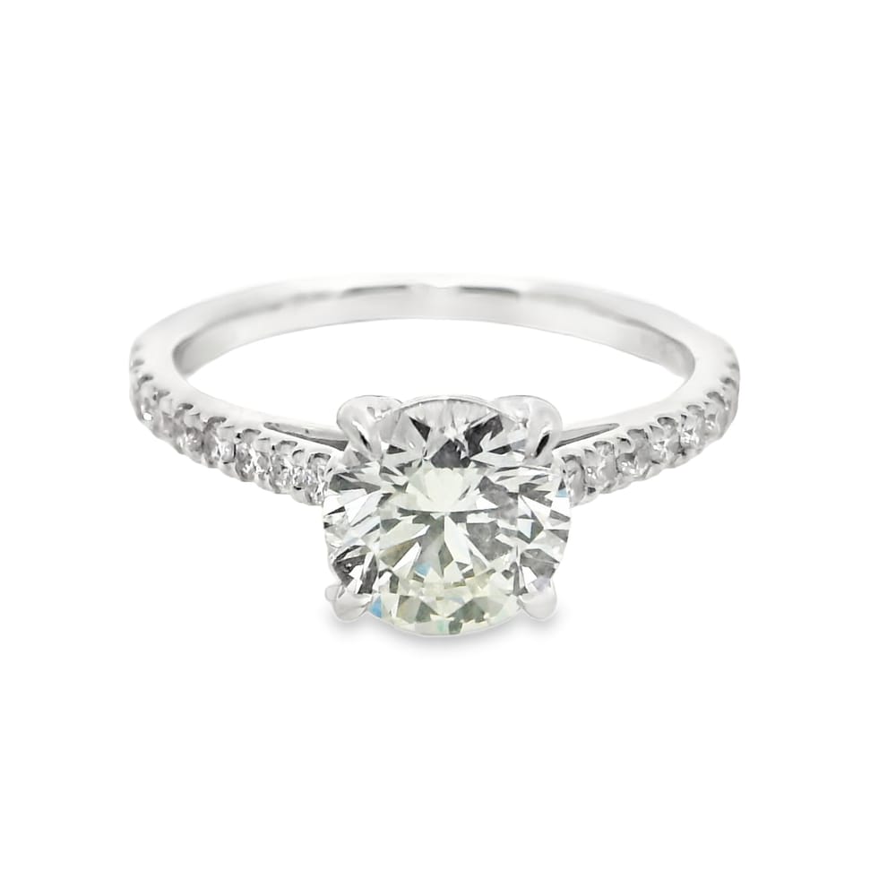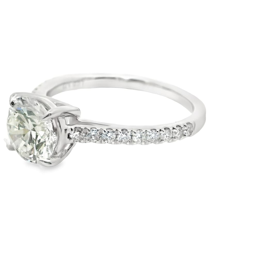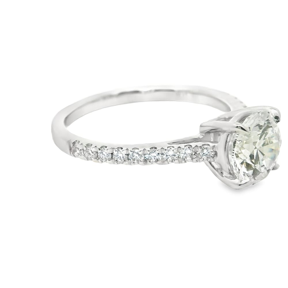 This exquisite engagement ring features a 1.56-carat lab-grown round diamond, showcasing exceptional clarity and an E color grade. The elegant 14K gold setting, combined with side diamonds totaling 0.27 carats, is perfect for the modern woman who appreciates both beauty and ethics in her jewelry.