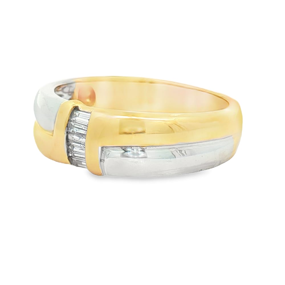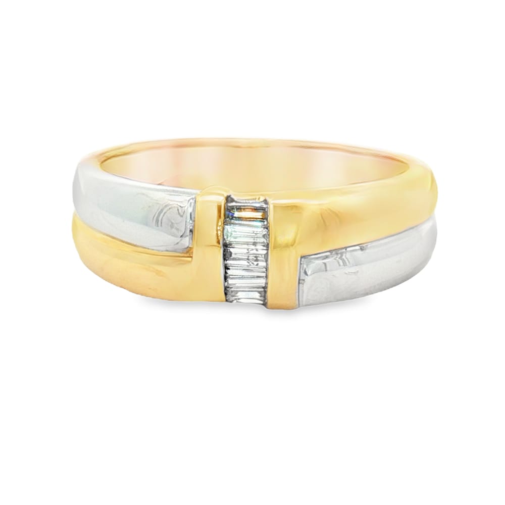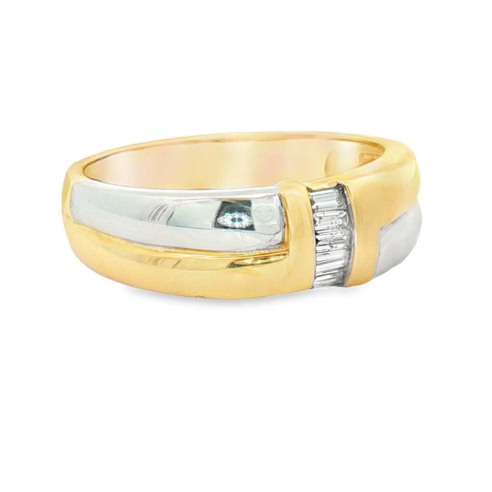 Celebrate your love with this exquisite women’s wedding band crafted in 14KT yellow and white gold, featuring elegant baguette diamonds totaling .23 carats. With a charming weight of 5.9 grams, this ring is a perfect symbol of enduring commitment and style.