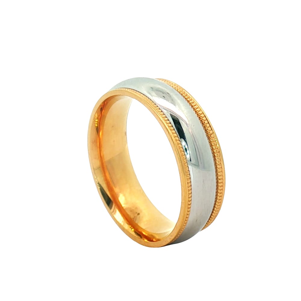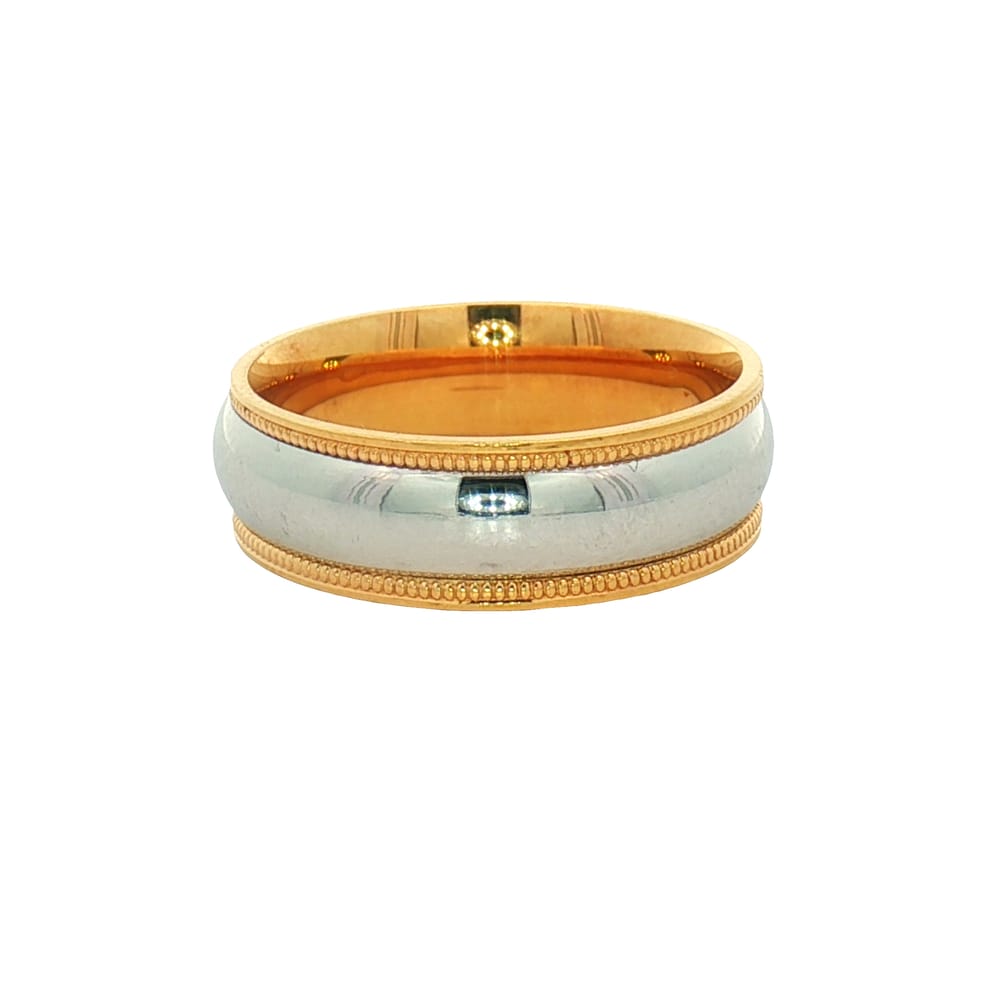 This exquisite women’s wedding band features a luxurious platinum center flanked by warm 18KT yellow gold borders, creating an elegant contrast. Weighing 7 grams, this 6mm wide band beautifully combines sophistication and durability for a timeless symbol of love.