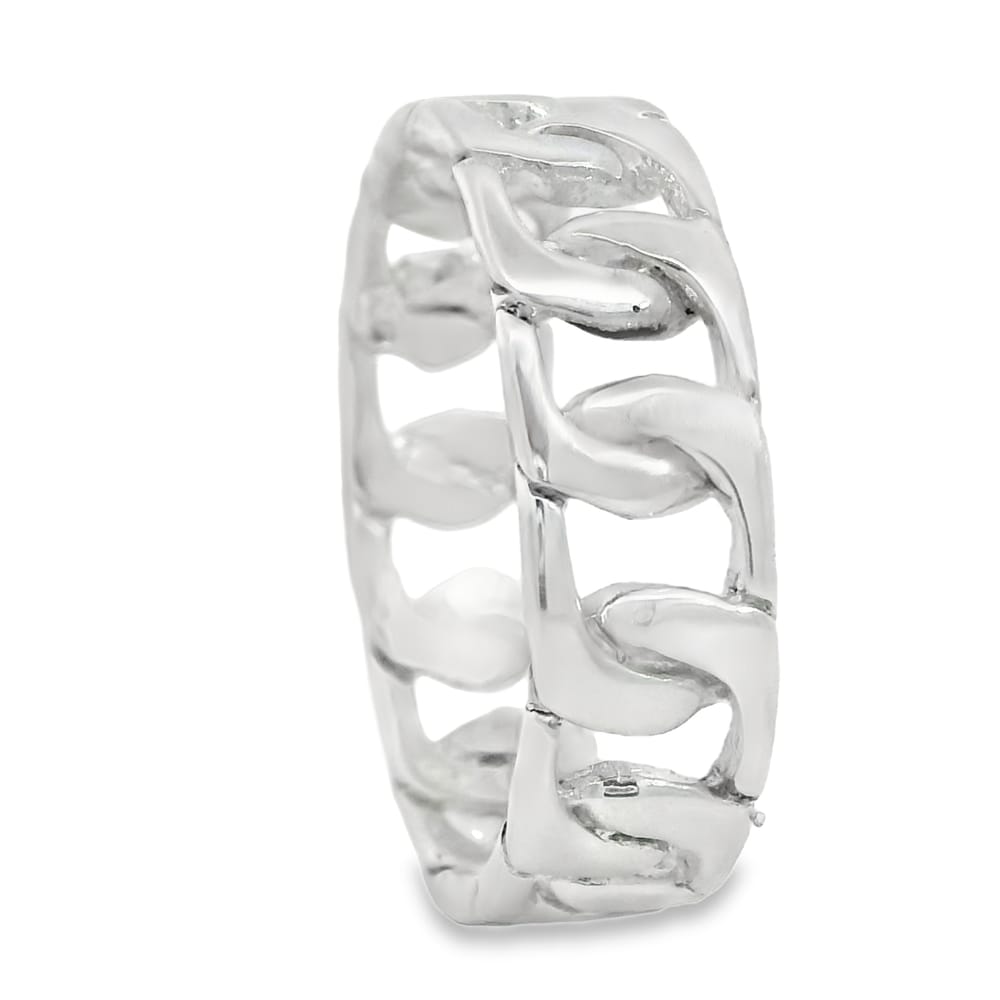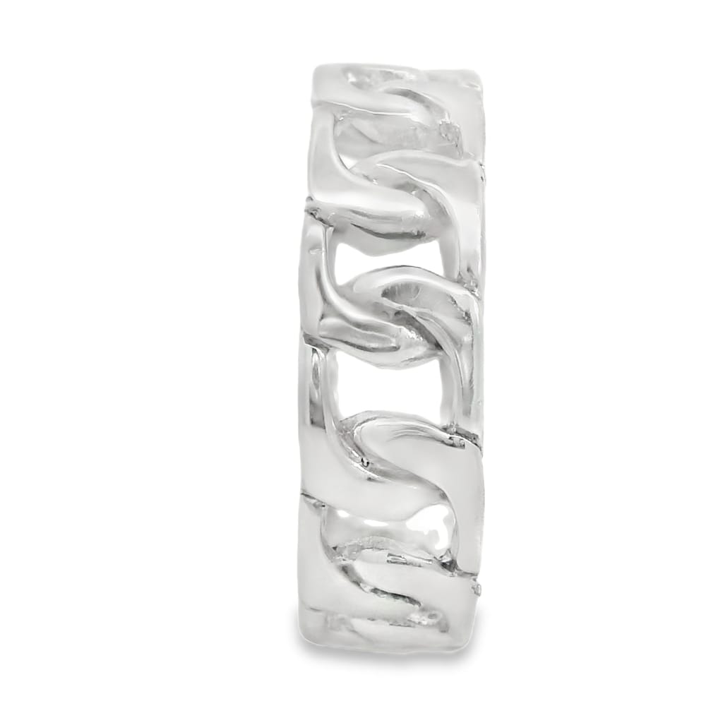 This exquisite wedding band features a polished 7.5mm design crafted from sterling silver, offering a sleek and modern aesthetic. Weighing 5.34 grams, its unique chain link pattern adds a touch of sophistication for any gentleman.
