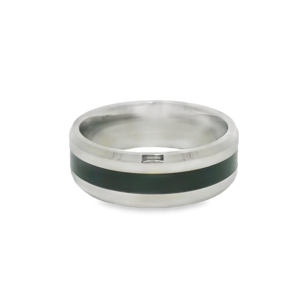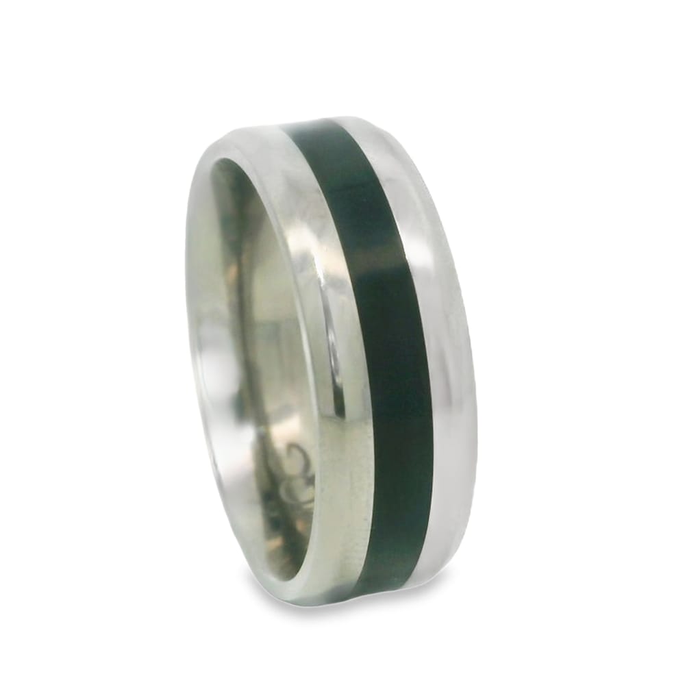 This exquisite wedding band features a durable titanium construction, elegantly complemented by a sleek black enamel finish. With its polished surface and 8mm width, it perfectly combines style and strength, making it a remarkable choice for a lifelong commitment.