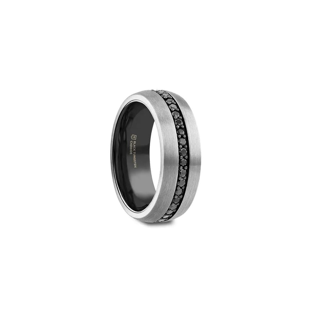 The PILOT Gunmetal Tungsten Ring with Black Sapphires has a style that’s out of this world. Fly him to the moon and back with your love and this elegant men’s wedding band. The brushed finish on this 8mm gunmetal tungsten ring complements the glistening row of round-cut black sapphires like a tailored tuxedo jacket.