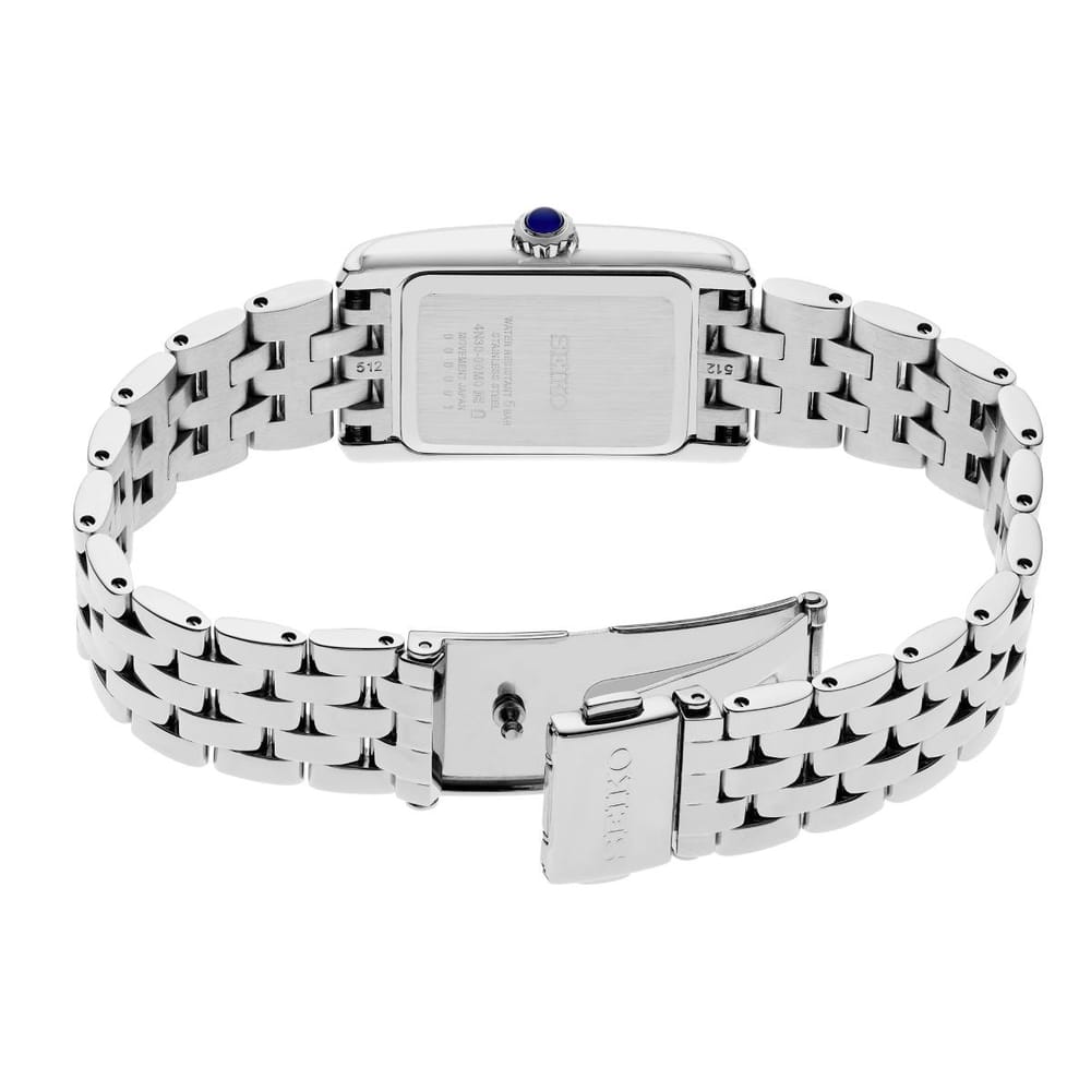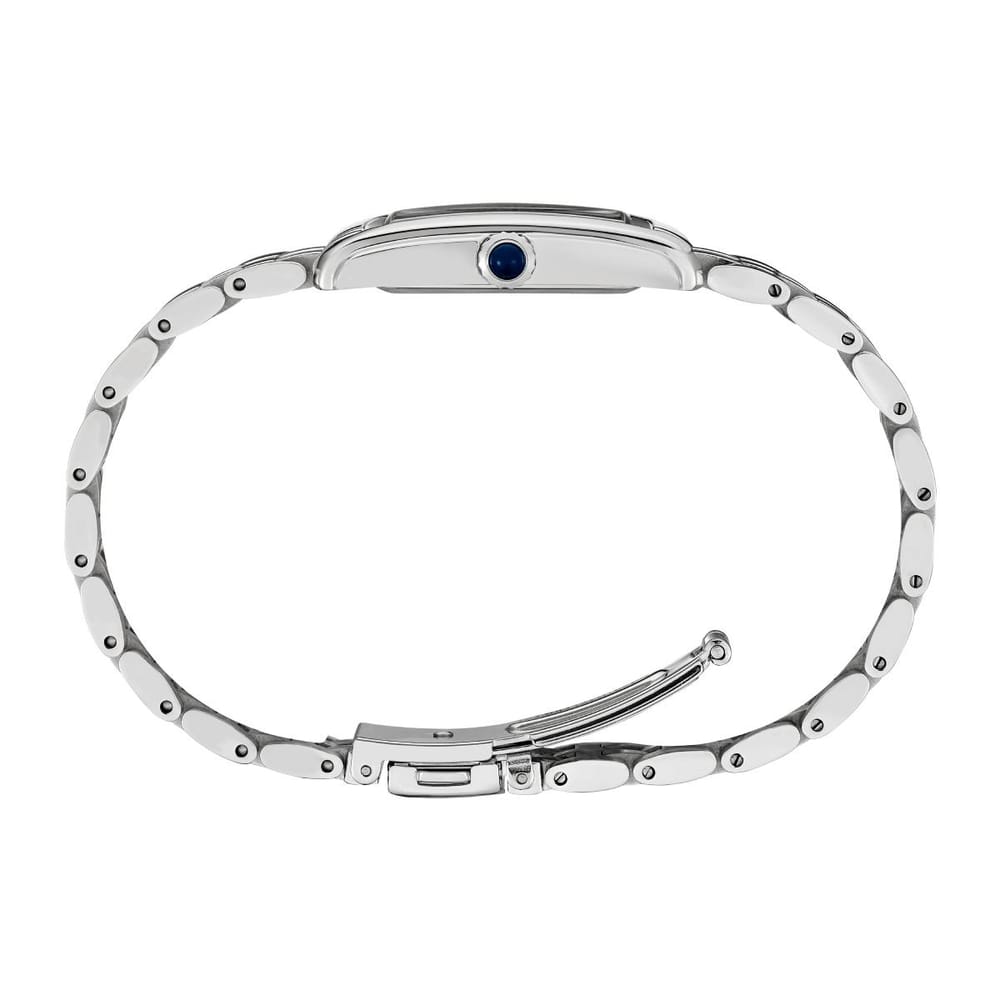 From the Essentials Collection. A sophisticated classic, perfectly proportioned for a jewelry-like feel, this elegant rectangular case watch offers a patterned blue Roman numeral dial, silver hands and markers, and a blue cabochon crown.