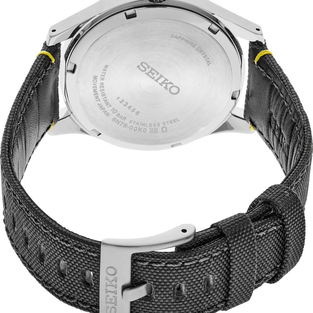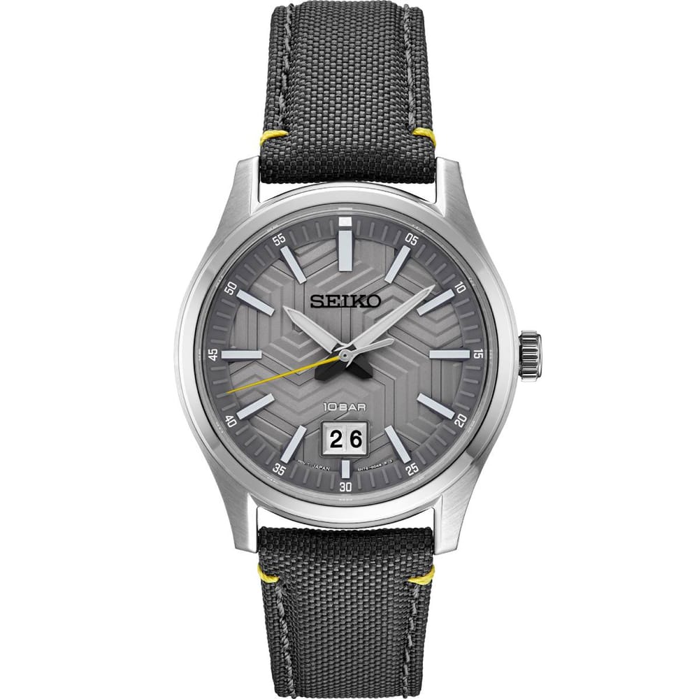 From the Essentials Collection. Designed to evoke the cool excitement of a night run, this smooth watch offers a slim profile for sleek sport or everyday wear. In a modern gray monochromatic color scheme, this subtly updated watch adds a streetwear edge with the Y-shaped shoe-sole pressed pattern on its matte textured gray dial. With a big date calendar and LumiBrite hands and markers, this distinctive timepiece features a stainless steel case, secure screwdown caseback, scratch-resistant sapphire crystal, and rugged nylon/leather strap with vivid yellow accent stitching. 10 bar, 100M Water Resistant
