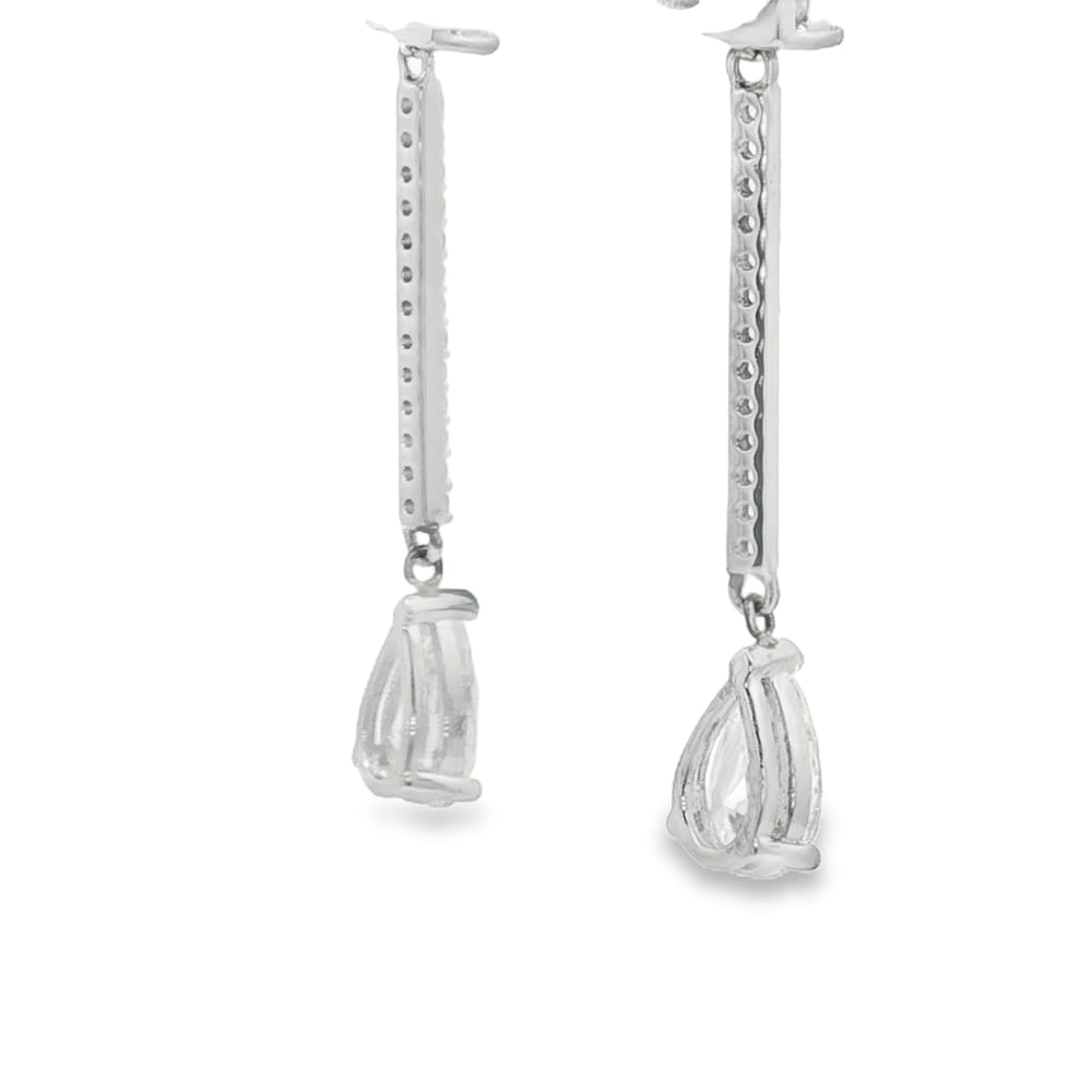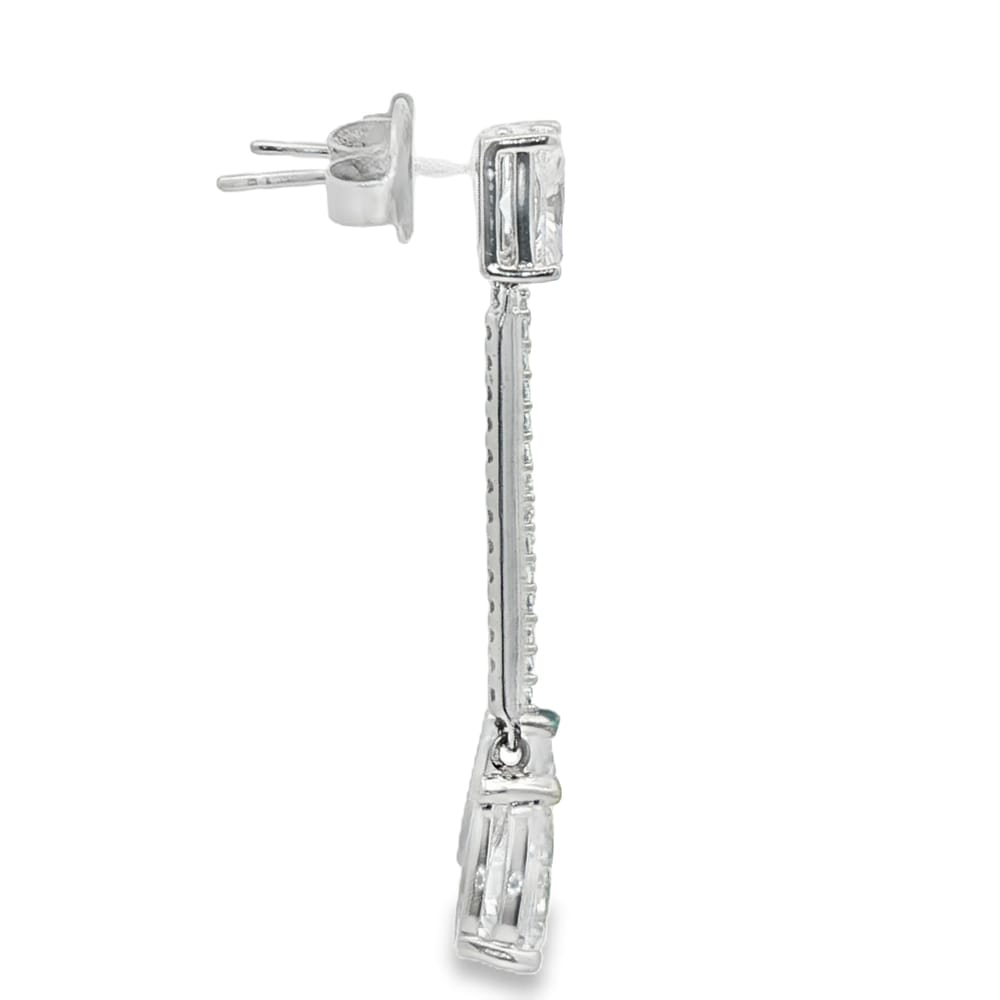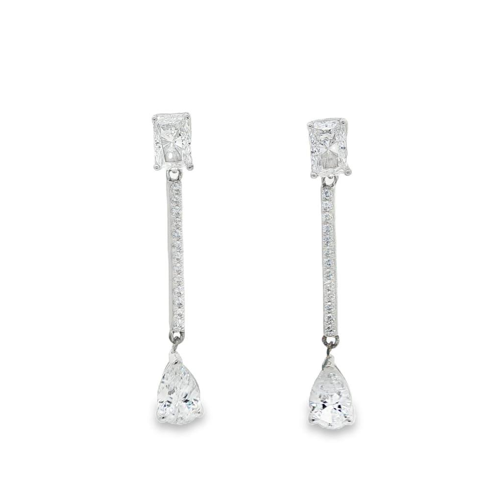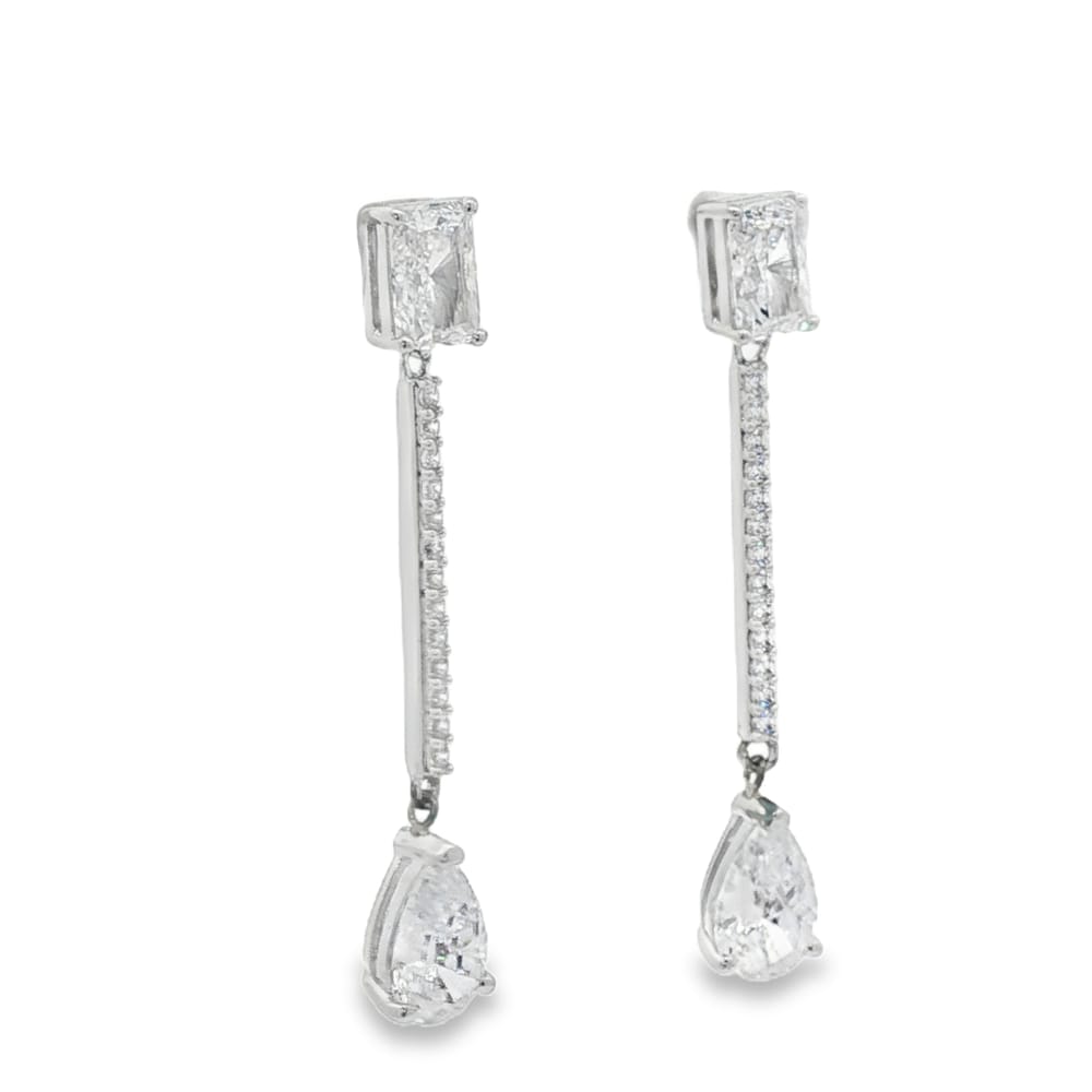 Elevate your style with these exquisite drop earrings featuring a captivating emerald cut cubic zirconia at the center, surrounded by elegant pear and round stone accents. Crafted in .925 silver, these earrings offer a luxurious yet affordable addition to any jewelry collection. Perfect for women seeking to add a touch of sophistication to their outfits, these earrings promise to turn heads on any occasion.