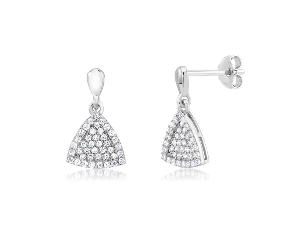 Elevate your accessory collection with these exquisite silver triangle-shaped micro pave dangling earrings. Crafted from .925 silver and adorned with sparkling cubic zirconia, they reflect elegance in every light. Perfect for adding a touch of glamour to any outfit, these lightweight earrings are a must-have for every woman.