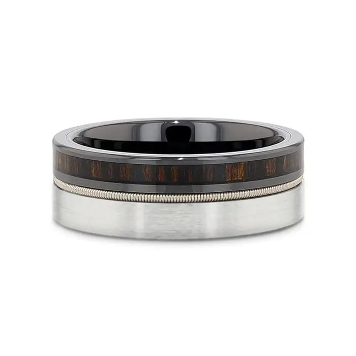 This sleek 8mm ring features a unique blend of tungsten and black ceramic, harmonizing elegance and durability. The intricate guitar string design adds a touch of character, making it perfect for music lovers and style aficionados alike.