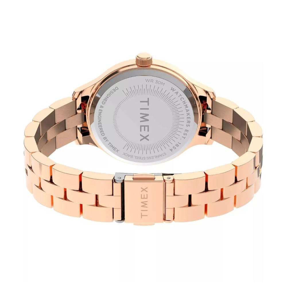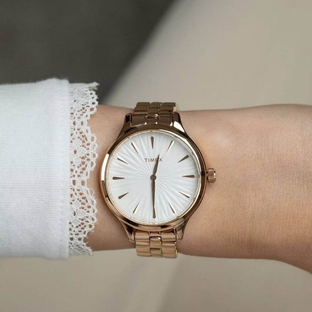 Elevate your style with the Timex Women’s City Peyton watch, a perfect blend of elegance and functionality. Featuring a luxurious rose gold stainless steel case and strap, this timepiece is both durable and eye-catching. The crisp white dial complements the sophisticated design, making it an ideal accessory for any occasion.