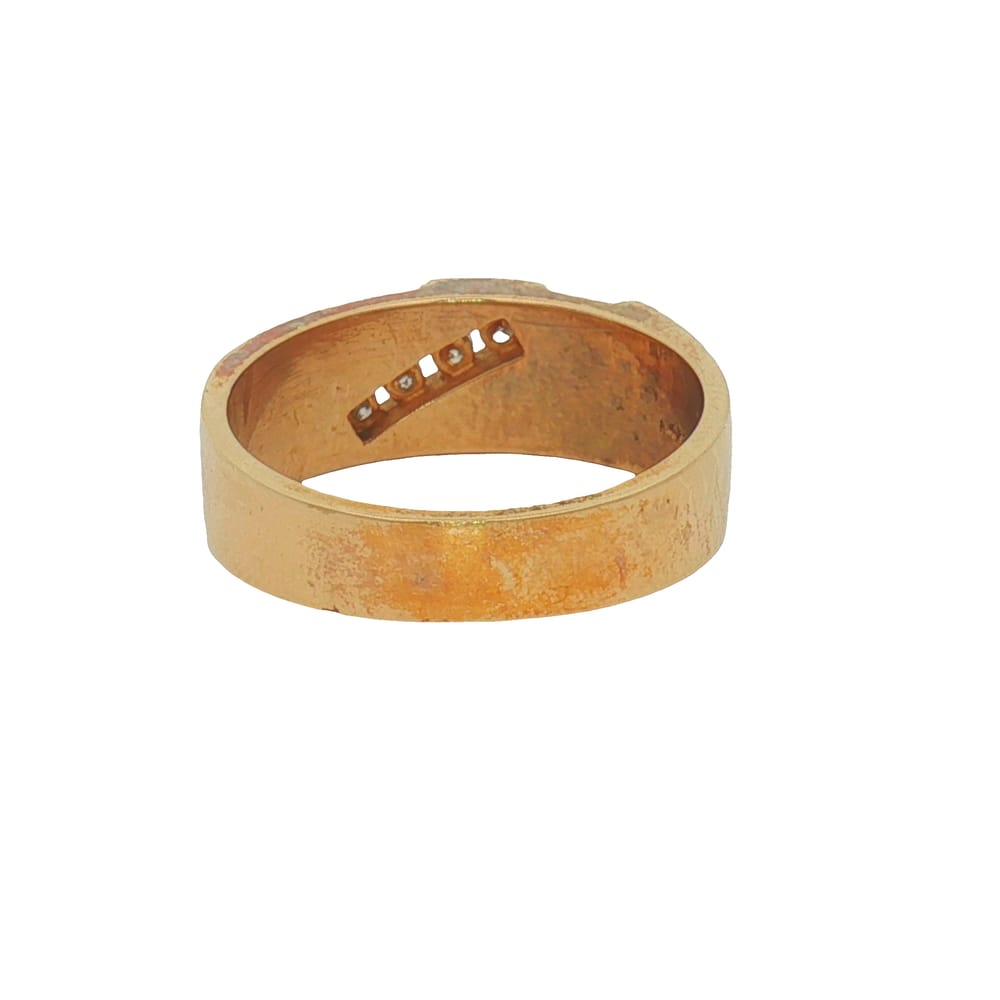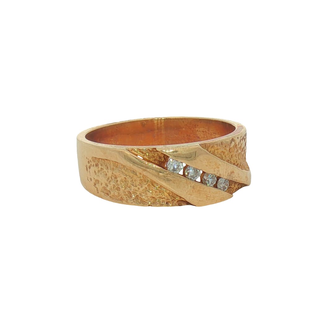 This elegant wedding band features a rich 14K yellow gold design that perfectly complements its textured finish. Adorned with four round diamonds totaling 0.15 carats, it adds a touch of sophistication and sparkle for the modern man. Ideal for symbolizing your commitment, this captivating ring effortlessly blends style and masculinity.