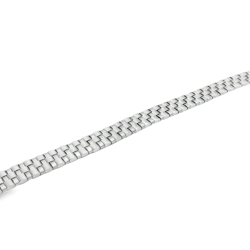 This elegant bracelet features a sophisticated basket weave design crafted in luxurious 14K white gold. It offers a perfect blend of style and sophistication for any occasion.