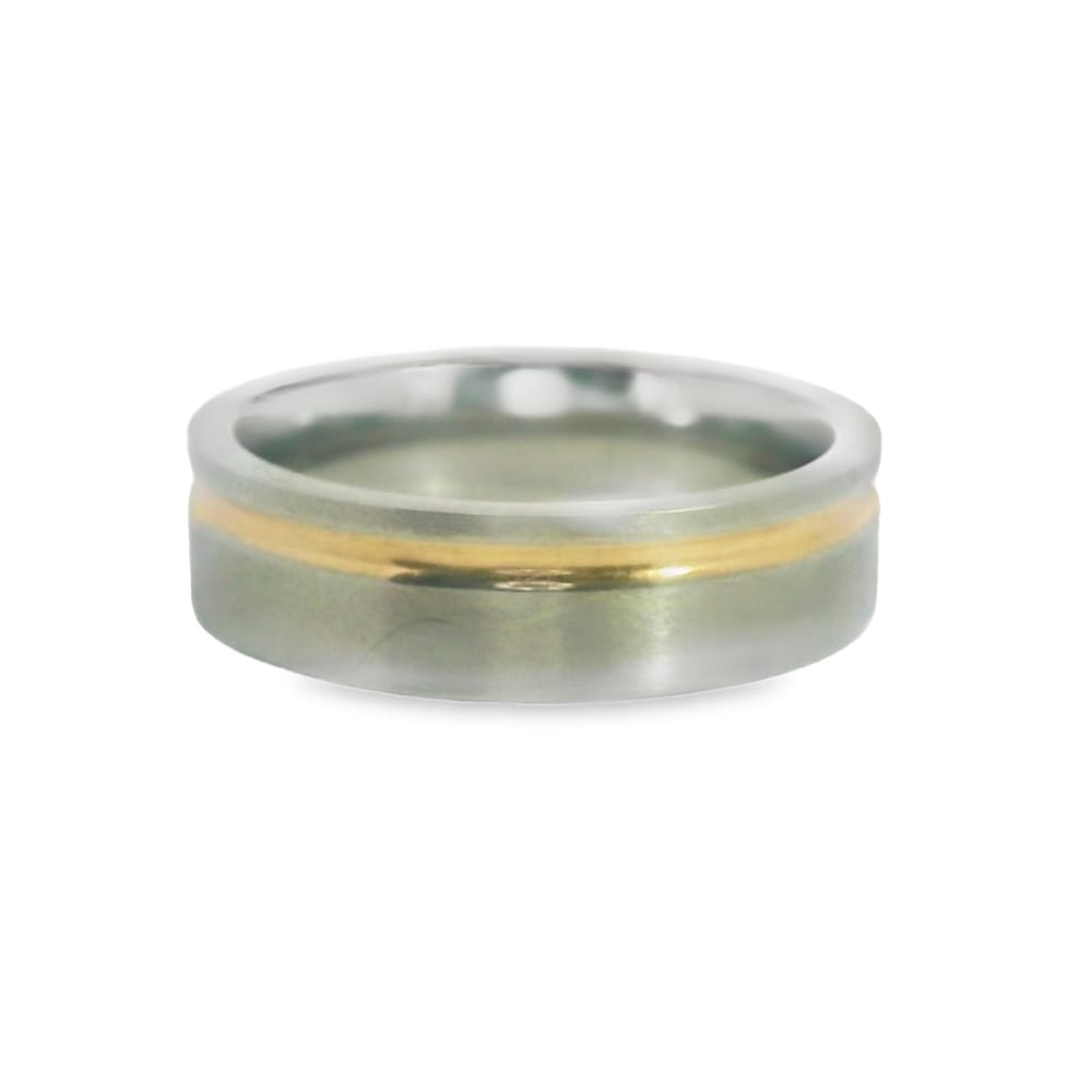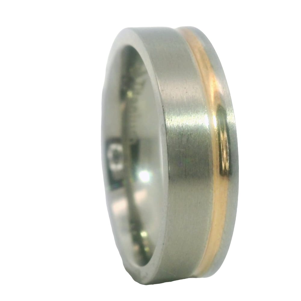 This men’s wedding band features a luxurious 18K rose gold PVD finish on a durable titanium base, combining elegance with strength. The grooved design ensures a modern aesthetic while the comfort-fit style guarantees all-day wearability.