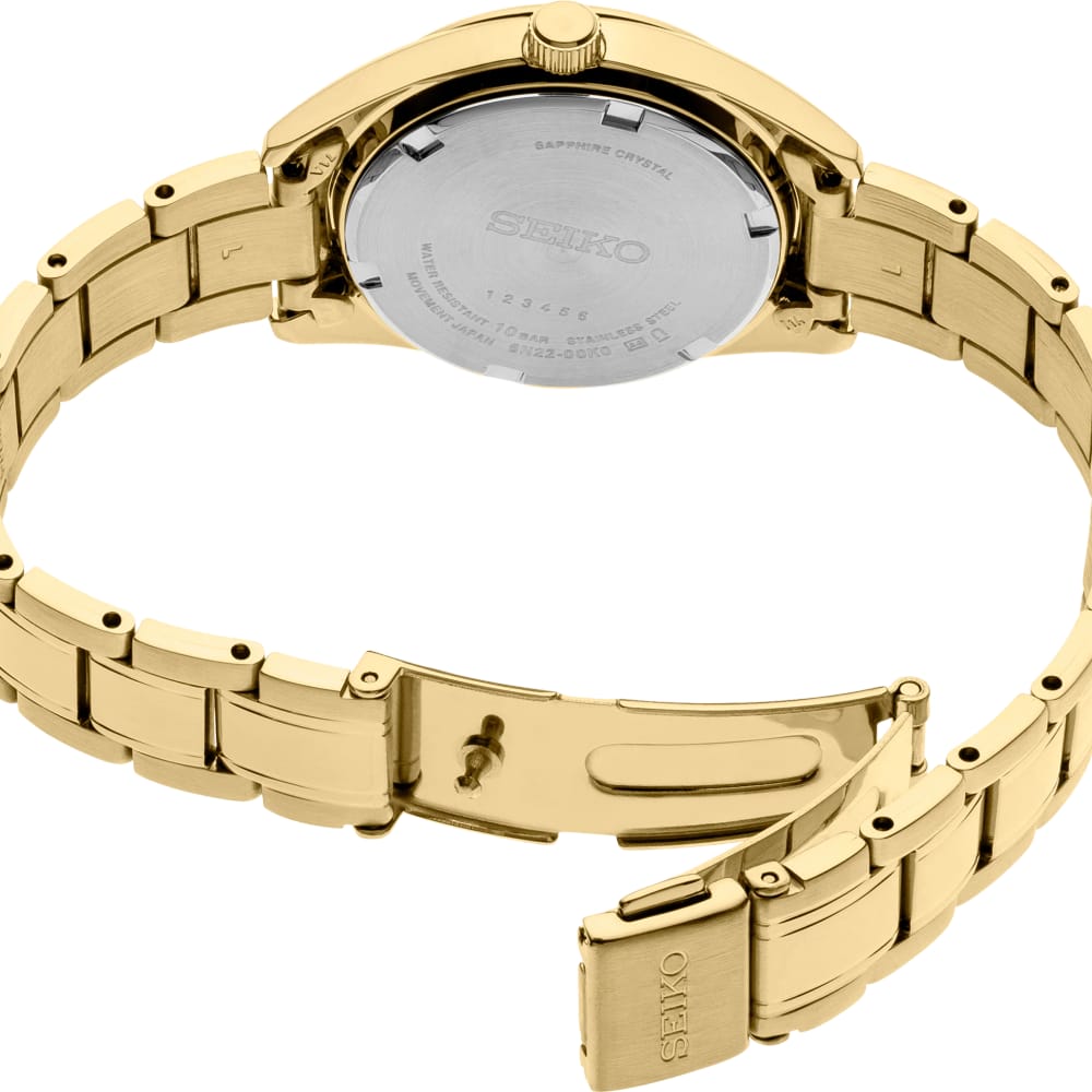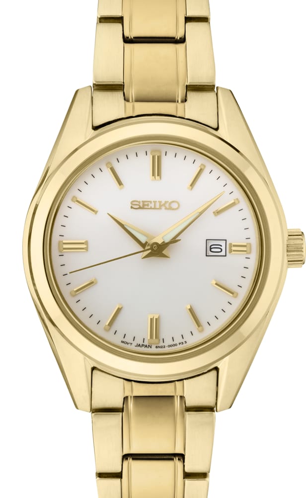 Crafted from stainless steel with a luxurious gold finish, the SUR632 is both durable and stylish. The sapphire crystal provides superior scratch resistance, ensuring your watch remains pristine over time. With a water resistance of up to 10 bar (100 meters), this watch is suitable for everyday wear and more adventurous activities. The Seiko SUR632 seamlessly combines sophisticated minimalism with reliable functionality, making it an ideal choice for those who appreciate timeless design and exceptional quality.