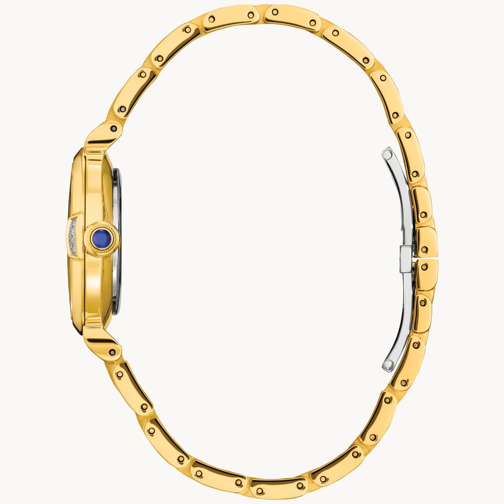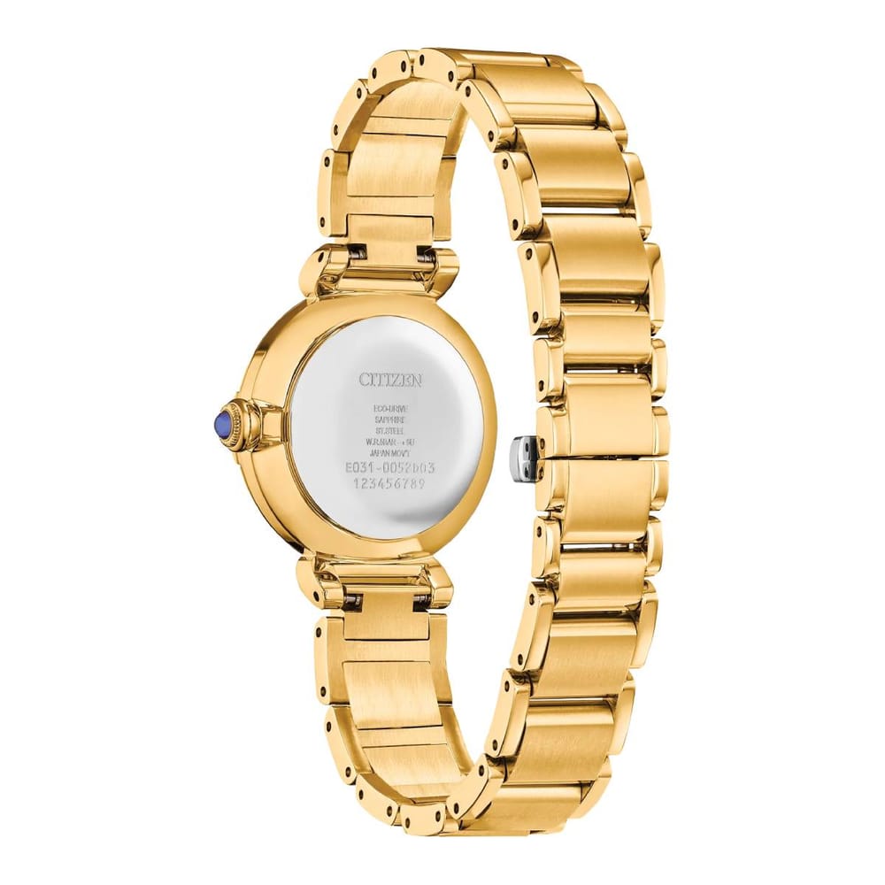Elevate your style with the Citizen L Mae Eco-Drive watch, embodying classic elegance and sustainable luxury. This exquisite timepiece showcases a shimmering white mother-of-pearl dial, accentuated by a dazzling diamond at the 8 o’clock position, all in a gold-tone stainless steel case.