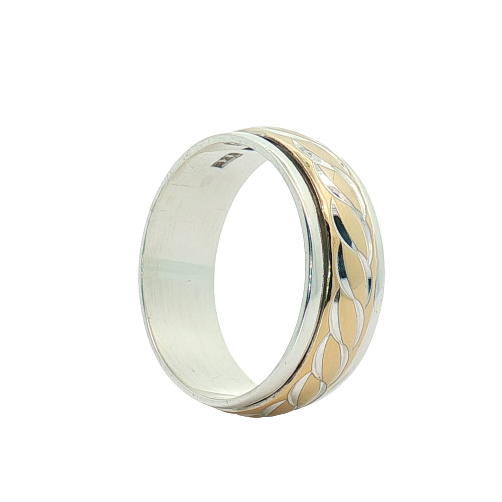 This elegant men’s wedding band features a striking combination of 10K gold and sterling silver, with a distinctive 7mm two-toned center spin design. Crafted with attention to detail, this ring perfectly balances durability and sophistication, making it an ideal choice for the modern groom.