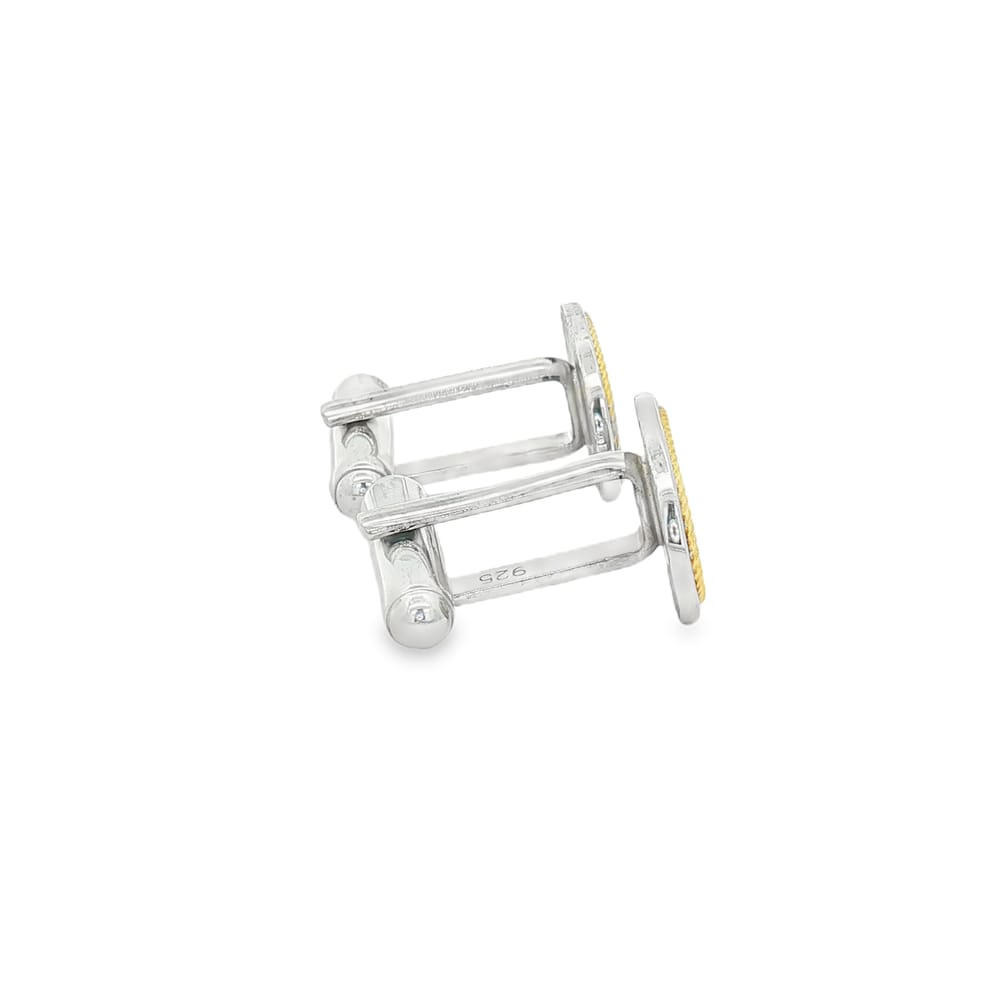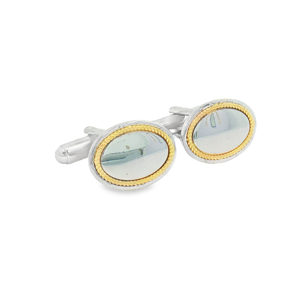Elevate your formal attire with these exquisite oval cufflinks crafted from sterling silver and adorned with 18K gold accents. Their elegant design harmonizes sophistication and style, making them a perfect accessory for any occasion. A must-have for any discerning gentleman looking to add a touch of luxury to his wardrobe.