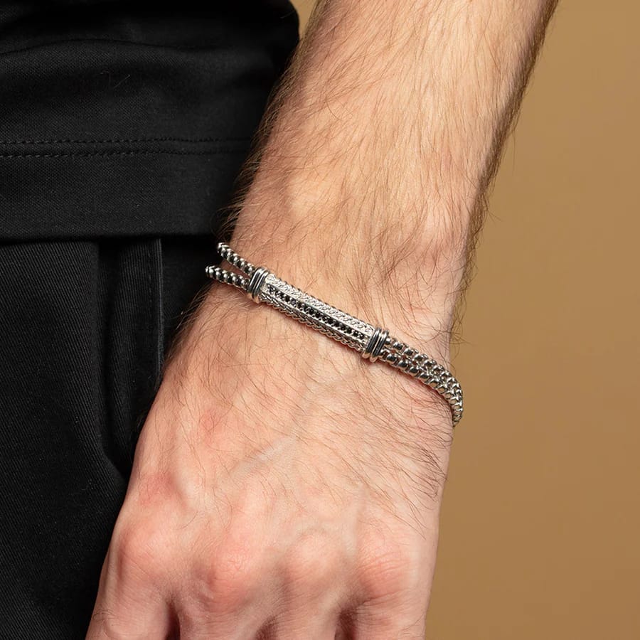 Our men’s jewelry is inspired by pieces that our designer would wear himself, a blend of classic and contemporary. The center bar features a braided texture and is set with natural black spinel gemstones. It forms perfectly with the wrist, featuring a double-strand box-link chain on each side. This piece is made in Italy by our artisans, and rhodium plated for high shine and to prevent tarnishing.
