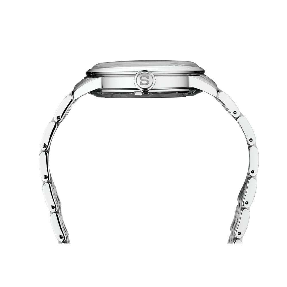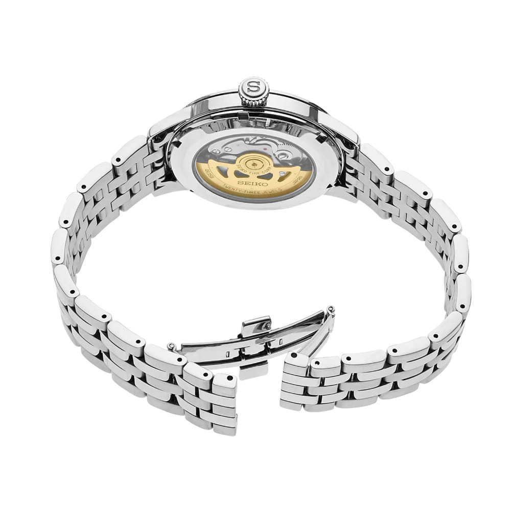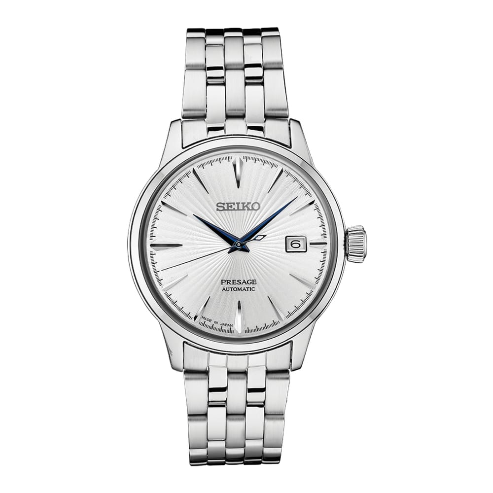 Experience the elegance of the Seiko Presage Cocktail Time watch. This exquisite timepiece features a silver-tone stainless steel case and strap, paired with a beautifully patterned white dial that adds a touch of sophistication. With an automatic movement and a case size of 40.5mm, this watch is perfect for both everyday wear and special occasions.
